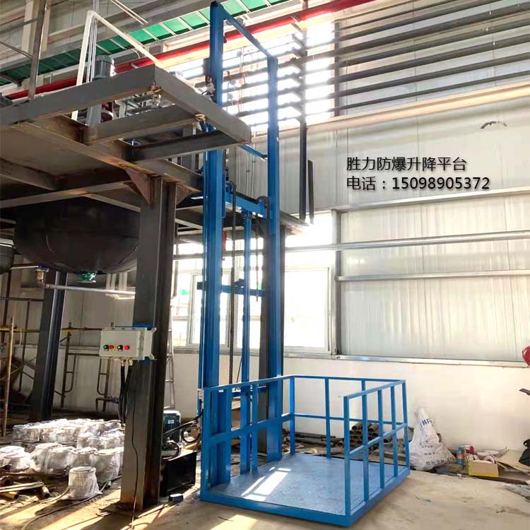防爆升降平台是一种快速实现楼层间货物运输的简易电梯,主要结构为液压式,因此也被称为防爆液压式升降货梯,一般防爆等级为ExdIIBT4,适用于化工车间、食品厂、药厂等需要使用防爆环境的场所。胜力机械生产的防爆升降平台载重从500公斤到100吨不等,提升高度根据客户现场的实际高度进行定制。平台的大小,是否需要轿厢,轿厢材质等都可以根据客户的需求定制,满足不同客户的使用要求。