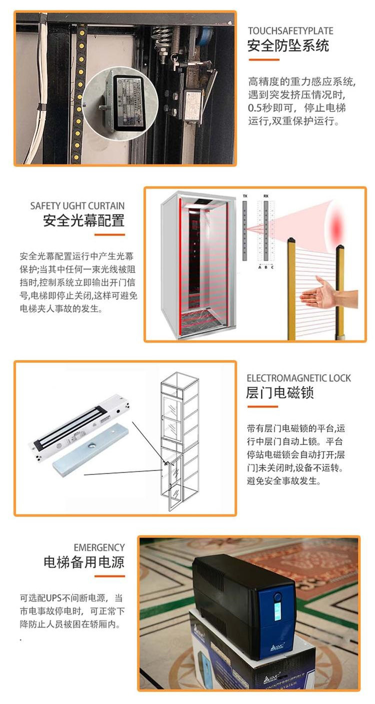 家用液压电梯是靠液压油缸顶升带动链条,链条带动轿厢上升,电梯控制系统装有无机变速变频器,电梯机械机构设计合理、安全可靠、升降平稳、采用油寖式合资静音泵站,升降过程中无噪音、无顿挫感??哦系纾蚊盘潘乇;に砸貉故降缣莸陌踩凳潜冉细叩?,更不会发生轿厢冲顶失速下降等情况。在电梯停电时按一下轿厢内的应急按钮,会接通回油阀,液压油慢慢的到油后电梯会靠自重慢慢下降,??恐烈徊恪?