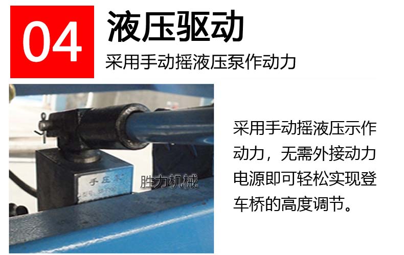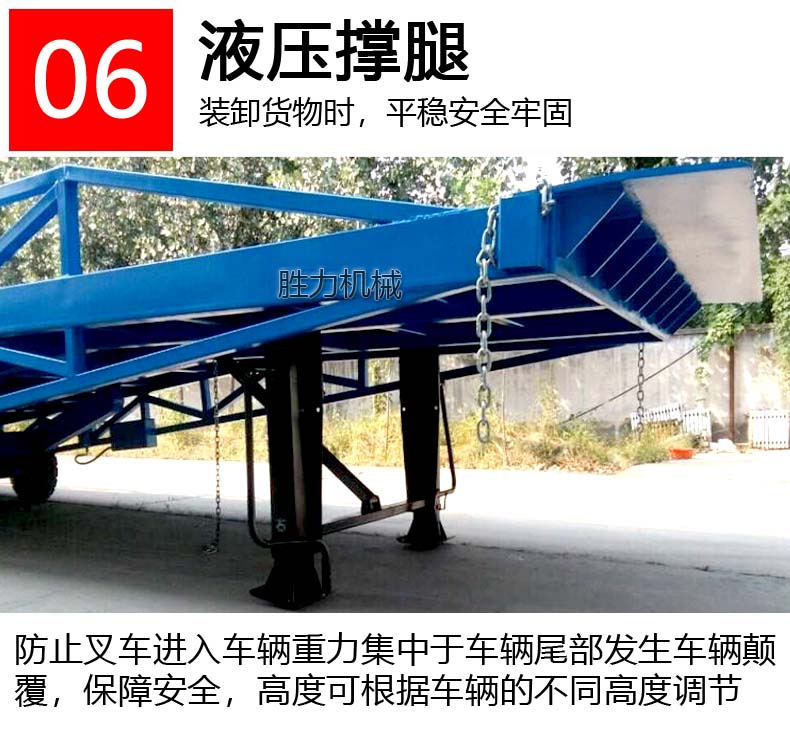 移动登车桥也被称作叉车装卸专用平台,是装卸货物的专用液压设备,设备带有移动轮,可随时移动到装卸地点。移动登车桥根据额定载重量可分为6吨、8吨、10吨、12吨、15吨,设备总长11米,带有坡度,叉车等搬运车辆可通过移动登车桥的坡度和高度直接驶入货车内部进行装卸货物作业,在提高装卸作业效率的同时又能充分保障作业安全。移动登车桥无需外接电源,可通过手压泵做动力进行能设备高度的调整,可以充分适应各种不同高度的货车。移动登车桥加快装卸货物的速度,减少劳动力,为企业获取更大的经济效益。