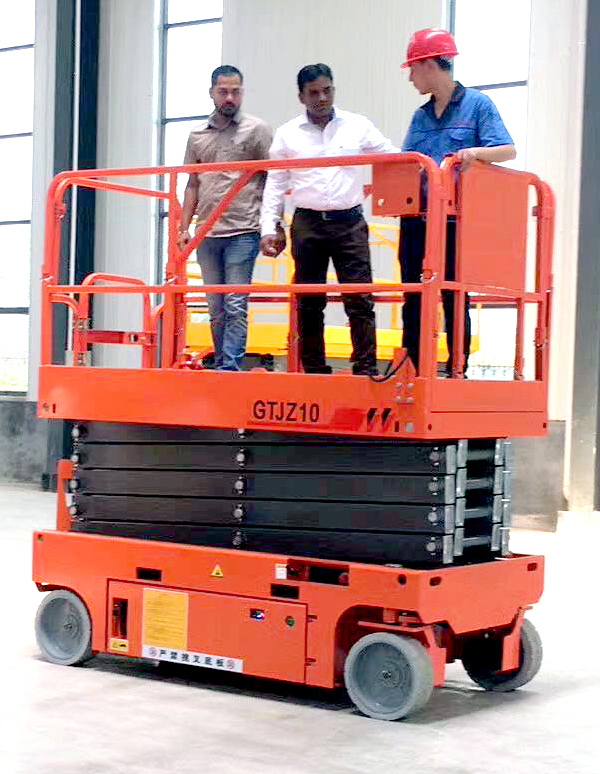 自行剪叉升降平台的剪叉机械结构, 使平台在升降过程中有着较高的稳定性,可减少工作人员在高空作业时的心里恐惧。自行剪叉升降平台的工作台面可水平延伸600mm,这样可以扩大作业范围,也可跨越一般性的障碍物进行高空作业。