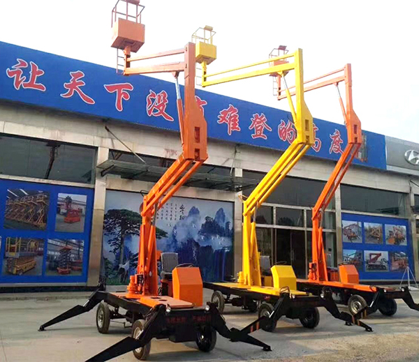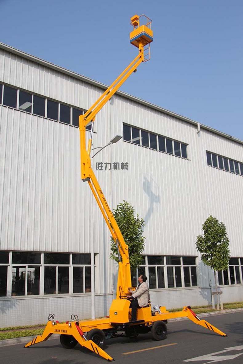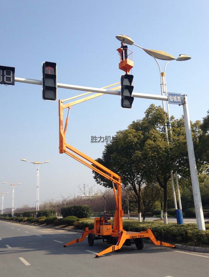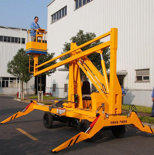 移动曲臂式升降平台是由二、三节升降臂组成的高空作业平台,可悬伸作业、也可跨越障碍物在一处地点进行多点作业,它采用液压撑腿,360度旋转作业,工作高度可达15米左右,特别适用于室外高空作业。移动曲臂式升降平中的运输方式非常简单,工作人员可在平台上通过方向盘直接把平台驾驶到工作地点。它的行走与升降动力一般为电瓶驱动或柴油发动机两种,为了便于操作,柴油发动机采用电启动方式。该产品被广泛应用于园林、电力、市政、摄影、路灯、广告、交通、大型工矿企业、车站、机场、码头等行业的安装维修及登高作业。