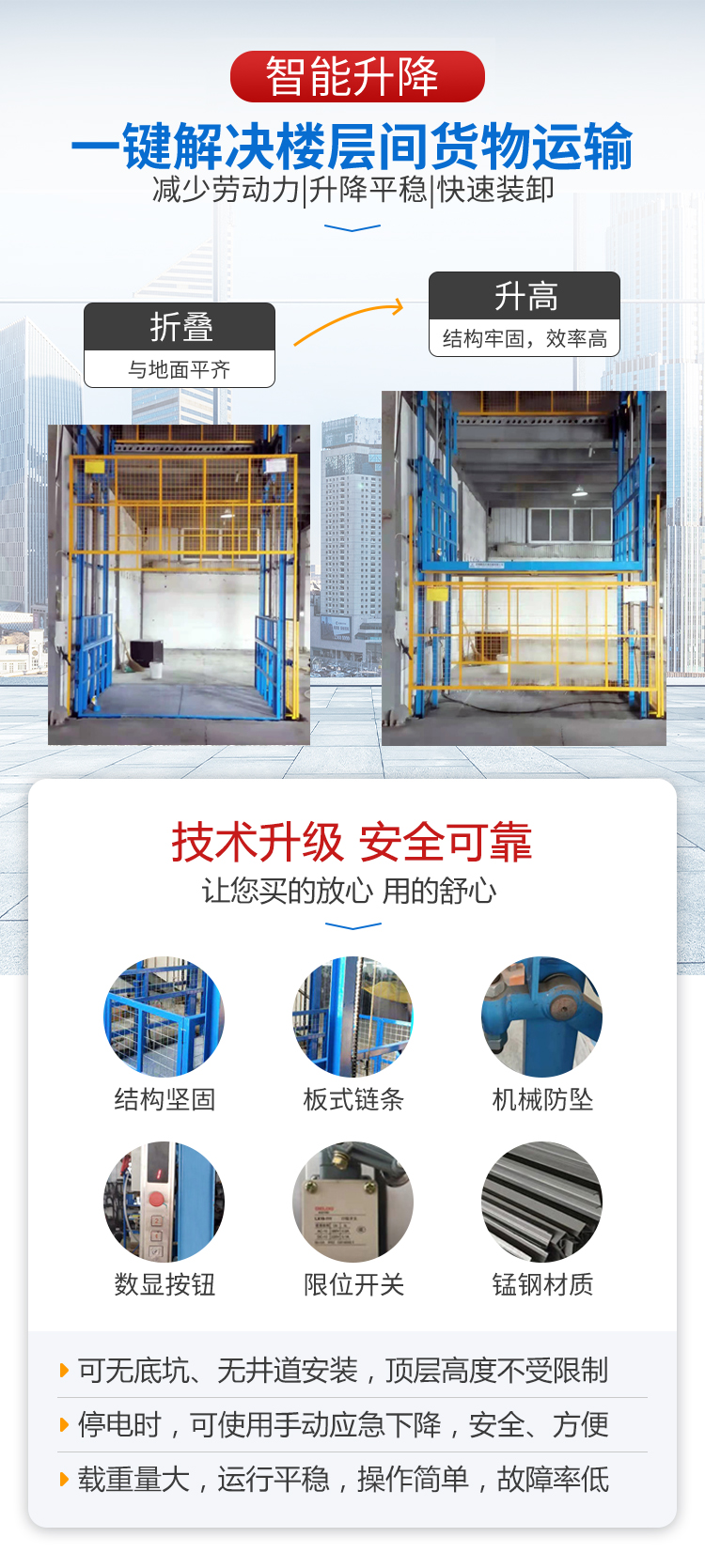 液压升降货梯安装环境不受限制,无需地坑和机房,室内外均可安装,特别适合于有多层工业厂房、仓库、超市等多楼层间的货物运输。液压升降机的平台尺寸、提升高度,额定载重可以根据不同企业的使用需求定制生产,也可定制防爆型升降平台,防爆等级为ExdIIBT4。