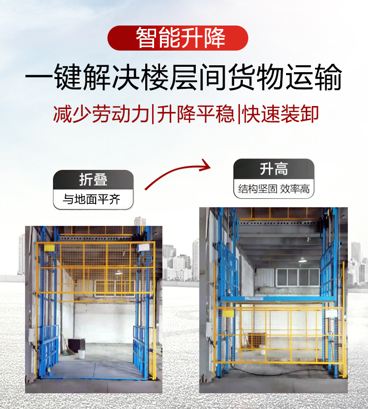 液压升降货梯安装环境不受限制,无需地坑和机房,室内外均可安装,特别适合于有多层工业厂房、仓库、超市等多楼层间的货物传输。产品特点: