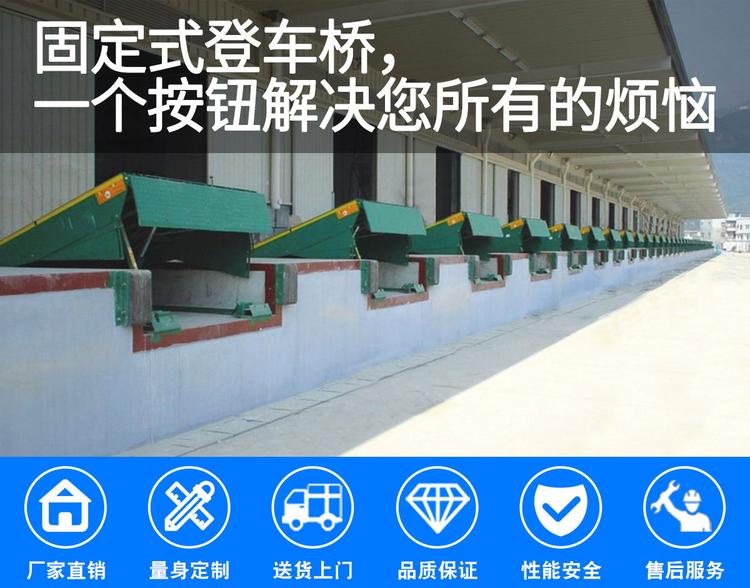 固定式登车桥是与仓储月台一起的装卸辅助设备,本设备与月台一体,可根据货车车厢不同高度调节即可调高也可调低,它的高度调节功能使货车与库房的货台之间架起一座桥梁,方便叉车驶入车厢内部进行货物的批量装卸。设备采用进口液压泵站,两侧设有防轧裙板,工作更加安全,仅需单人作业,即可实现货物的快速装卸。固定登车桥可使企业减少大量劳力,提高工作效率,获取更大经济效益。固定登车桥被广泛应用在装卸车频繁、车型不一的大型企业、仓库、车站、码头、仓储物流基地、邮政运输、物流配送等。
