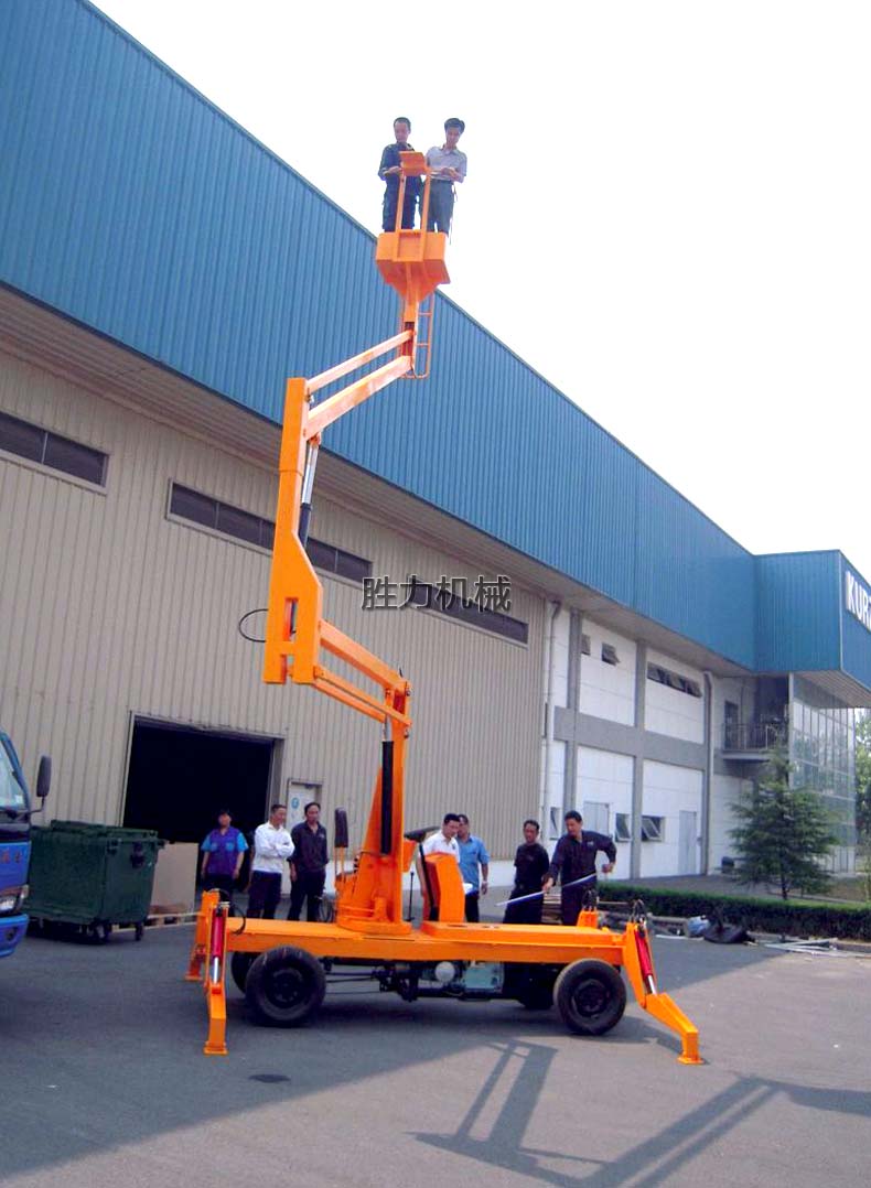 移动曲臂式升降平台是由二、三节升降臂组成的高空作业平台,可悬伸作业、也可跨越障碍物在一处地点进行多点作业,它采用液压撑腿,360度旋转作业,工作高度可达15米左右,特别适用于室外高空作业。移动曲臂式升降平中的运输方式非常简单,工作人员可在平台上通过方向盘直接把平台驾驶到工作地点。它的行走与升降动力一般为电瓶驱动或柴油发动机两种,为了便于操作,柴油发动机采用电启动方式。该产品被广泛应用于园林、电力、市政、摄影、路灯、广告、交通、大型工矿企业、车站、机场、码头等行业的安装维修及登高作业。