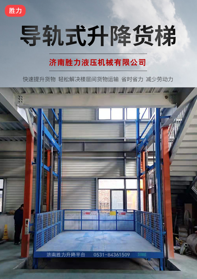 导轨式升降货梯安装无需地坑和机房,顶层高度不受限制,室内外都可以安装使用。
