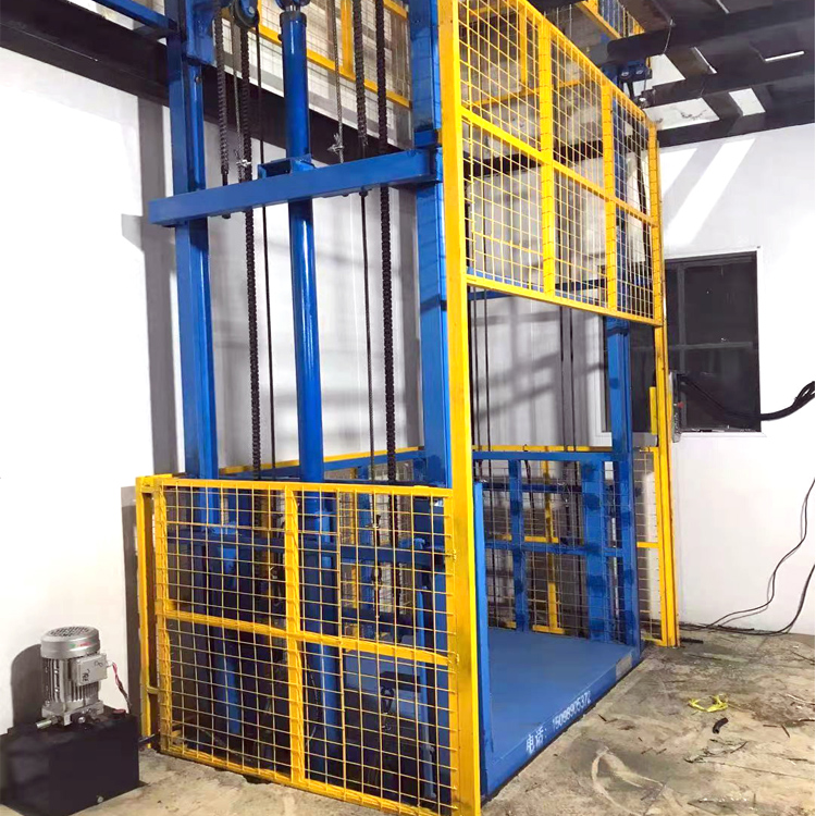 二层简易液压货梯梯是一种常见的液压升降设备,也被称为导轨链条式升降平台,平台主要采用液压油缸升降,通过链条和钢丝绳传动。