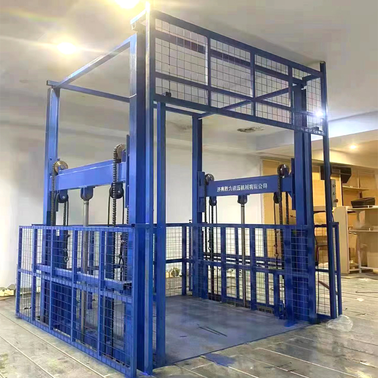 仓库升降货梯是一种液压升降设备,主要用于二三层以上的仓库、车间、超市等多层建筑物间的货物运输。仓库升降货梯是由导轨、链接、液压油缸、液压泵站、电控系统等组合而成的,因此也被称为导轨链条式升降平台。