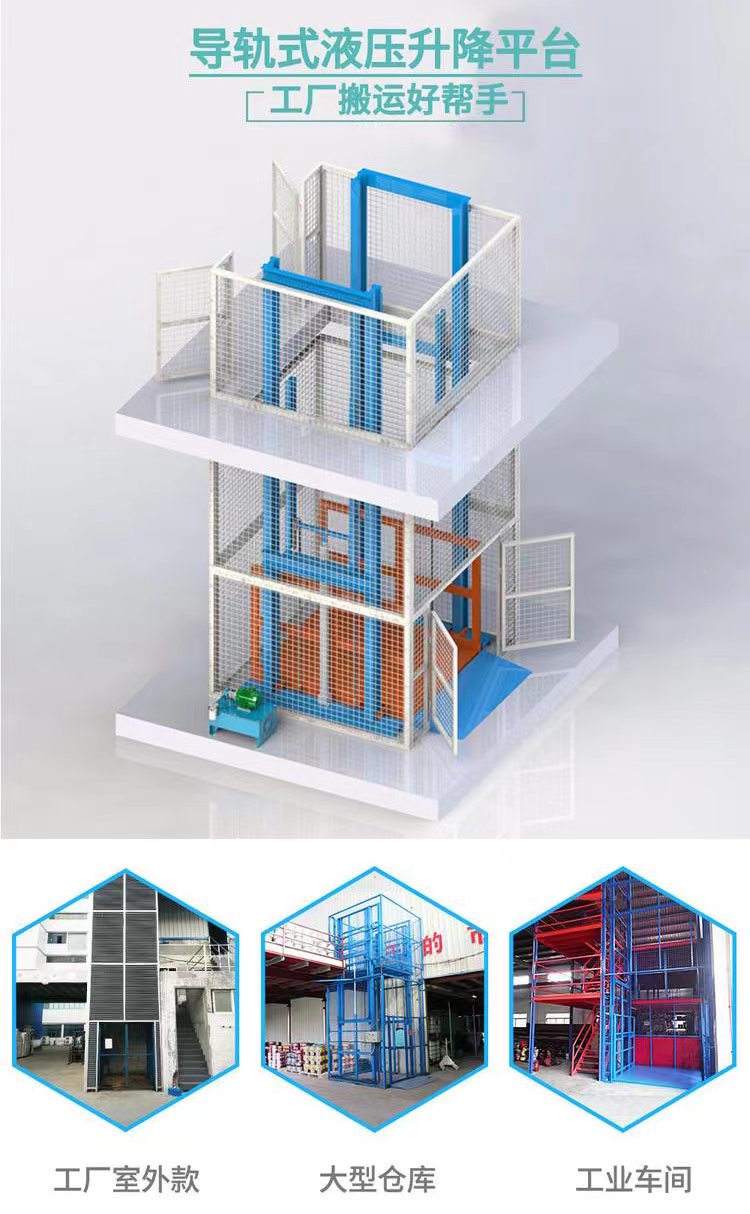 防爆液压升降货梯是一种由导轨、链条、油缸、液压泵站、电控系统组合而成的液压升降平台,因此也可以称为导轨式升降作业平台,其主要用途是把货物运送到不同的楼层,是替代传统电梯的理想提升平台设备,防爆液压升降货梯大多用于化工厂、制药厂、煤矿等需要防爆的企业。 防爆液压升降货梯的防爆等级大多为ExdIIBT4,也可根据客户要求定制其他防爆等级。