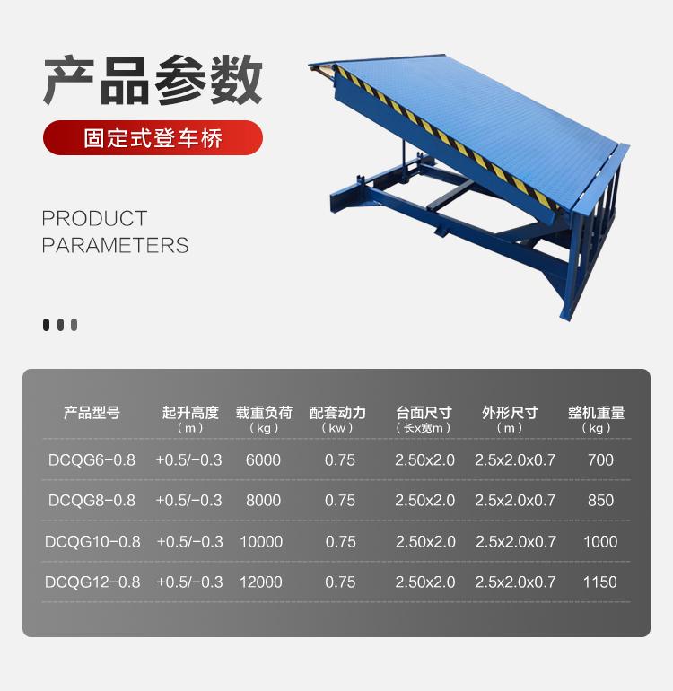 固定式登车桥是与仓储月台一起的装卸辅助设备,本设备与月台一体,可根据货车车厢不同高度调节即可调高也可调低,它的高度调节功能使货车与库房的货台之间架起一座桥梁,方便叉车驶入车厢内部进行货物的批量装卸。设备采用进口液压泵站,两侧设有防轧裙板,工作更加安全,仅需单人作业,即可实现货物的快速装卸。固定登车桥可使企业减少大量劳力,提高工作效率,获取更大经济效益。固定登车桥被广泛应用在装卸车频繁、车型不一的大型企业、仓库、车站、码头、仓储物流基地、邮政运输、物流配送等。